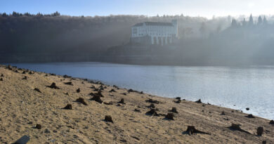 9. Z důvodů přestavby hráze přehrady je hladina cca 10 metrů pod normálem.